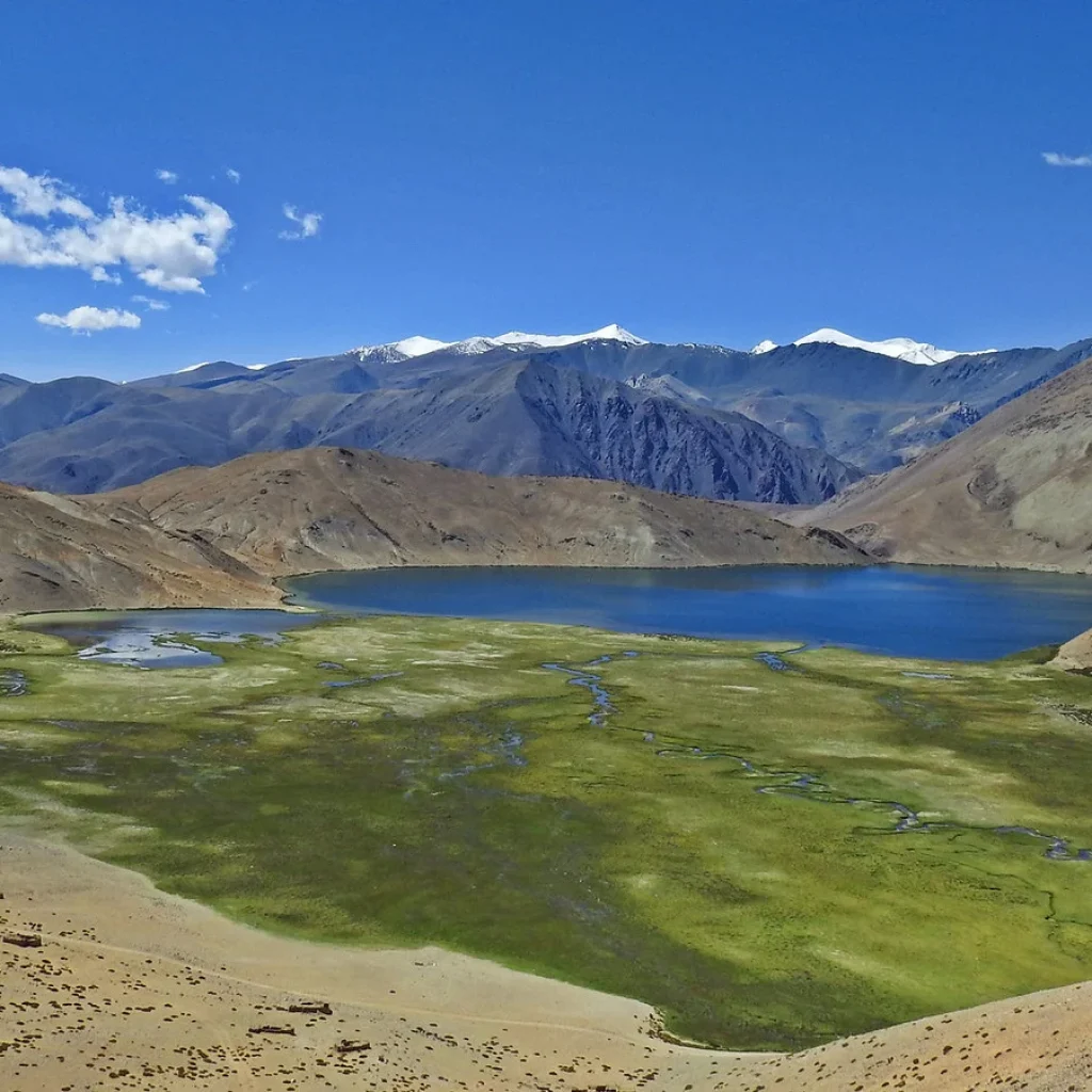 Tso Kar Lake, also known as the “White Lake,” is a hidden gem in the Rupshu Plateau, about 153 km from Leh. This high-altitude saltwater lake sits at over 4,500 meters in the Changthang region and is famous for its white salt deposits along the shores.